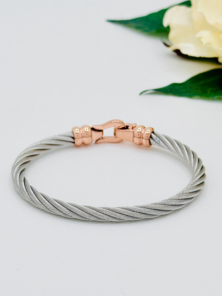 Style No: 04-102-1214-5 Stainless steel cable bangle, 5mm Rose gold PVD clasp |