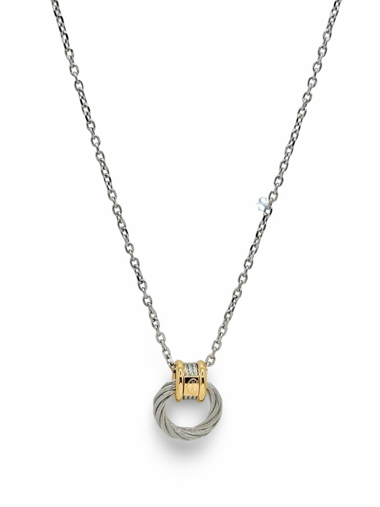 Style No: 08-108-1139-43Stainless steel chain necklace and stainless steel cable (3mm) & (1mm) with yellow gold PVD pendant Chain length: 40 cm + 10 cm |