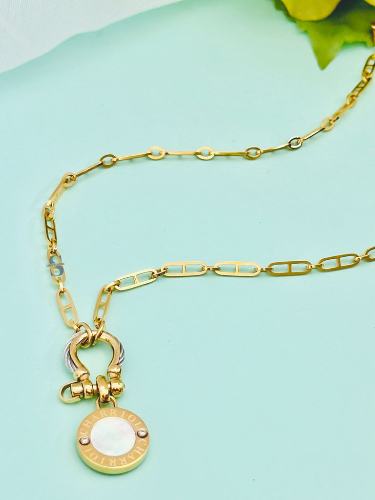 Style No: 08-104-1272-1Stainless steel necklace with yellow gold PVD Stainless steel cable (2mm) Buckle & white Mother-of-pearl coin pendant dimension 37mm x 16mm x 2.8mm 3 CZ stones Chain length 40 cm + 5 cm extension |